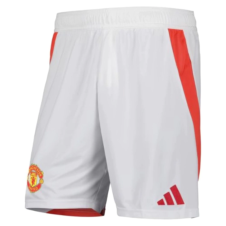 O escudo do Manchester United está bordado no lado direito, em vermelho e amarelo.