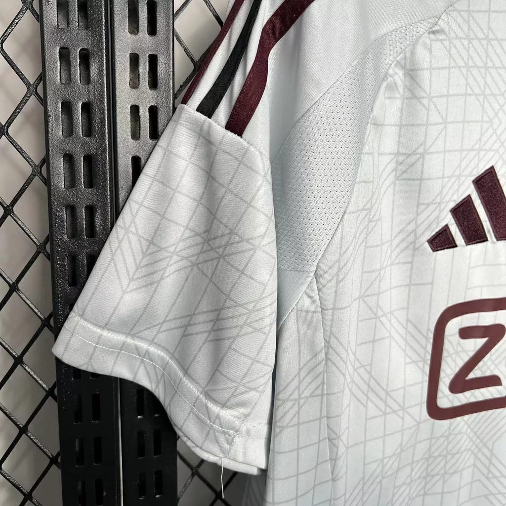 A nova terceira camisa do Ajax apresenta um design predominantemente branco, com linhas gráficas em cinza que se estendem ao longo do corpo, inspiradas na Escola de Amsterdã.