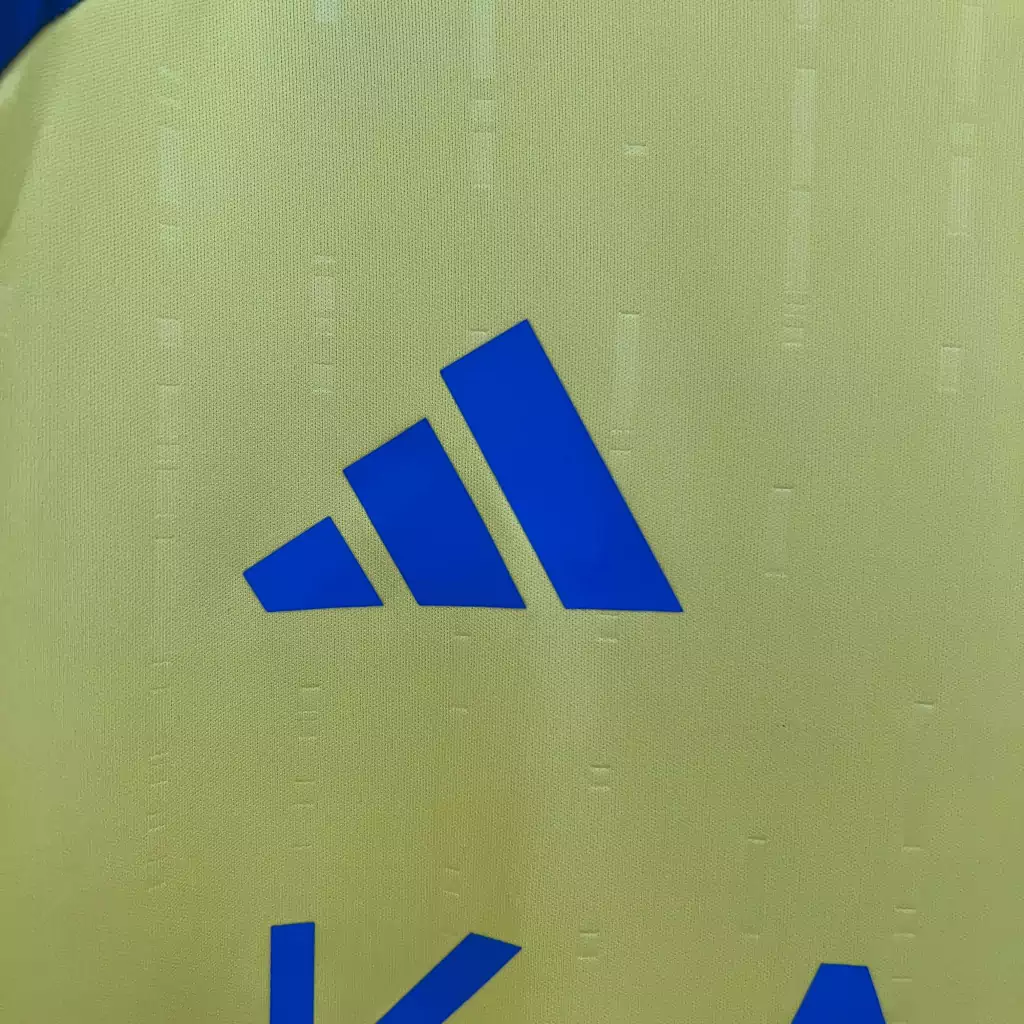 O escudo do Al-Nassr é aplicado no lado esquerdo, enquanto o logo da Adidas, o patrocínio master, assim como a numeração e o nome dos jogadores nas costas, aparecem em azul.