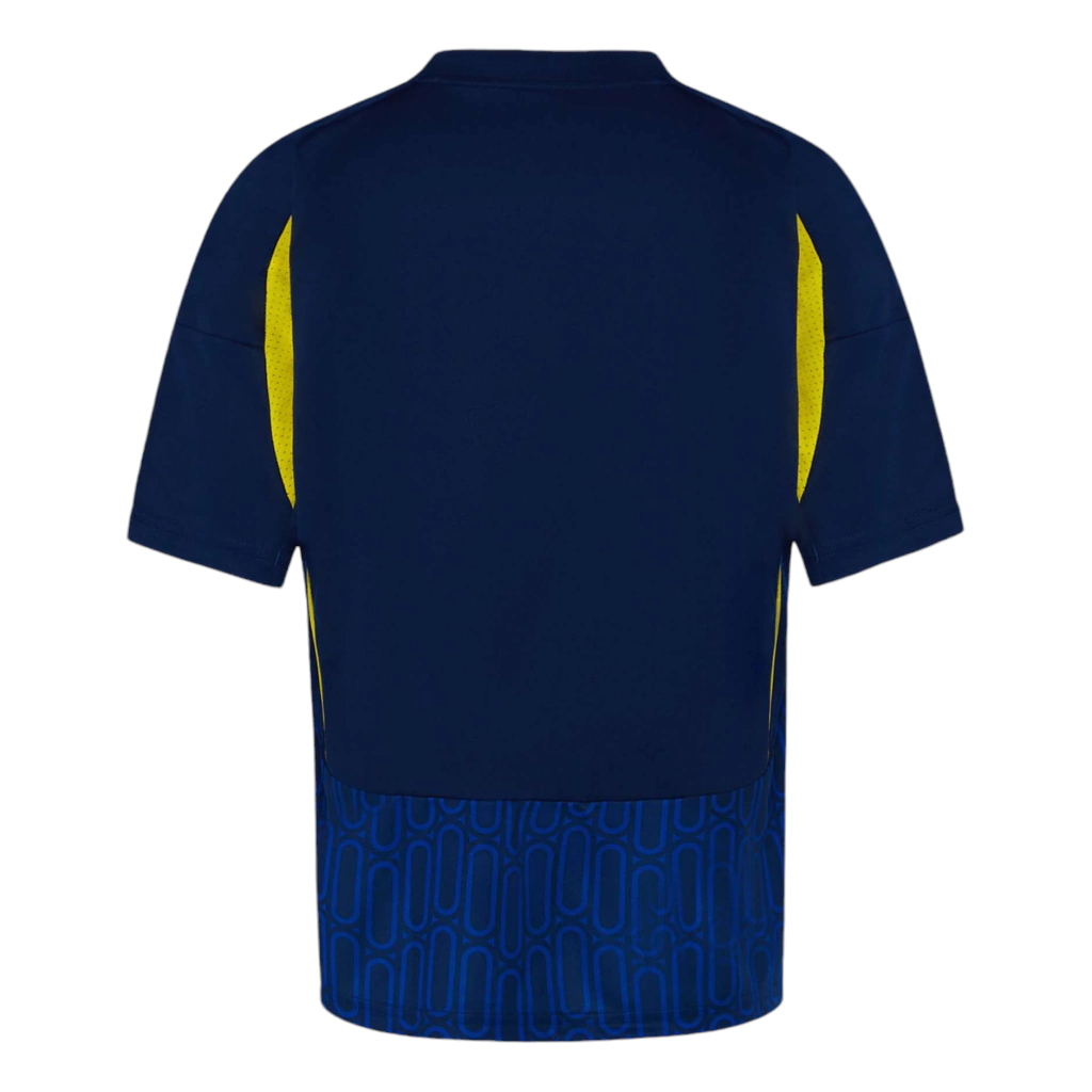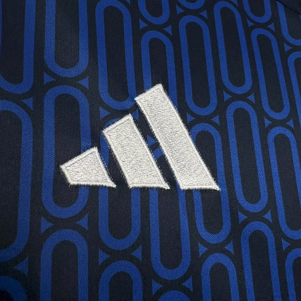 A nova camisa reserva do Al-Nassr segue o template padrão da marca alemã para a temporada, com predominância do azul marinho e um padrão gráfico de elipses em azul royal.