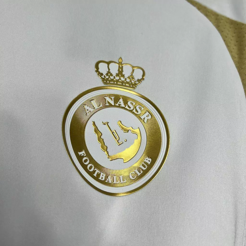 O escudo do Al-Nassr é estampado no lado esquerdo em sua versão tradicional, enquanto o logo da Adidas aparece em dourado, acompanhando a cor do patrocinador máster.