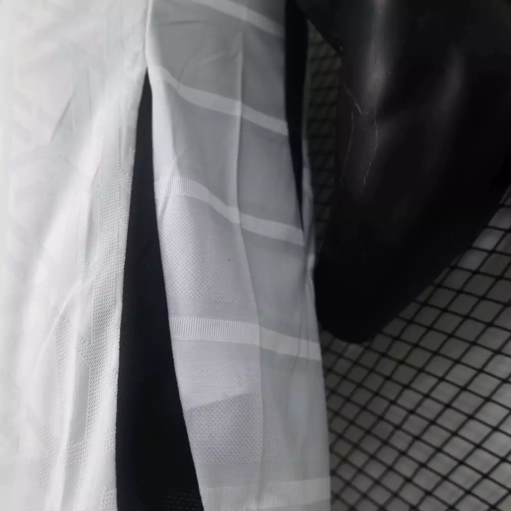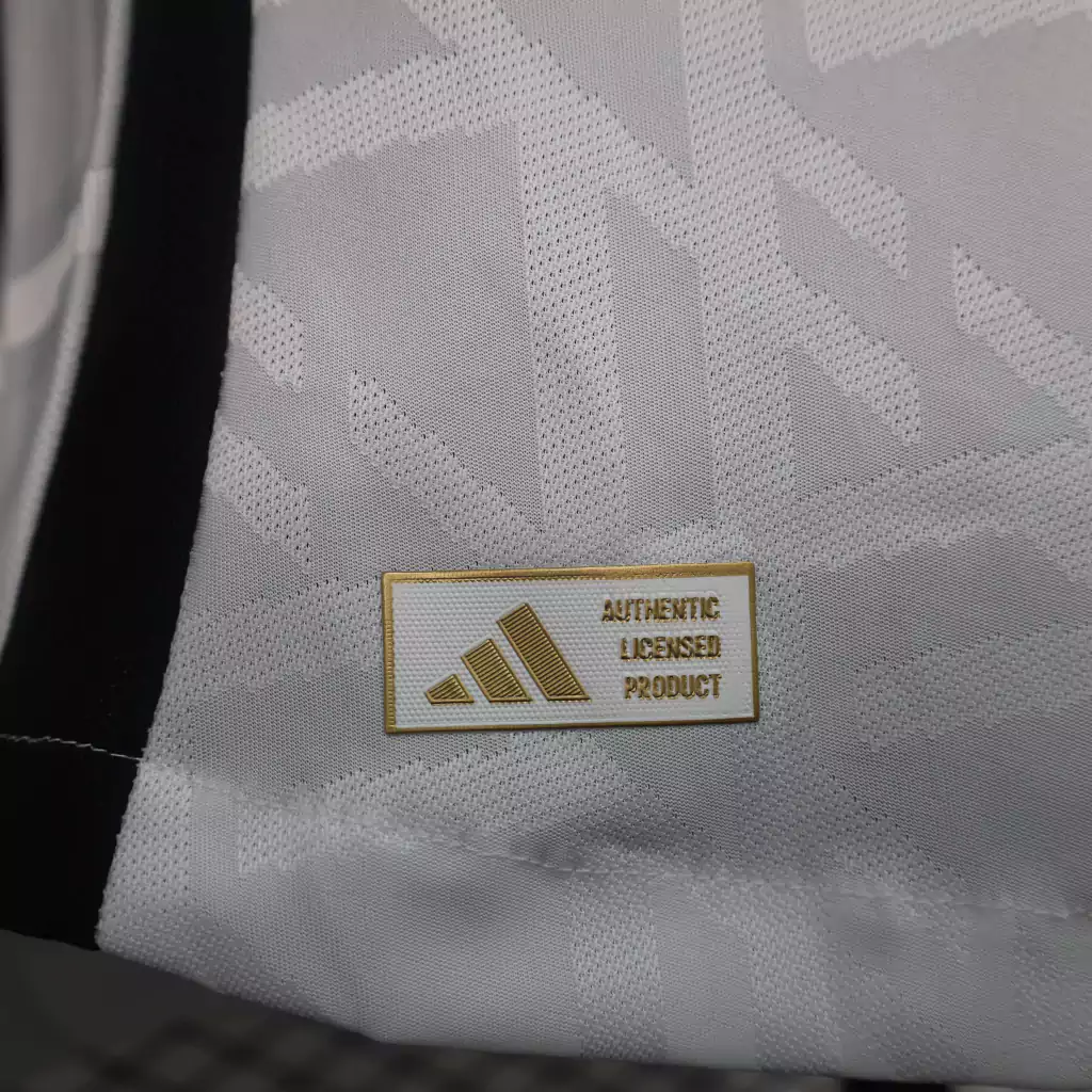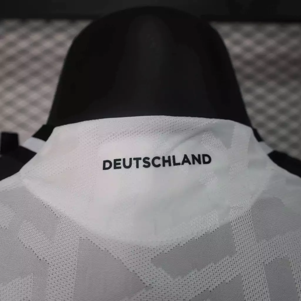 A gola redonda acrescenta um toque de sofisticação, com a parte frontal em branco contrastando com a nuca preta, realçada por um friso central branco. Abaixo da gola, o nome do país é exibido na língua materna, substituindo o tradicional “Die Mannschaft”, agregando um elemento de autenticidade e orgulho nacional.