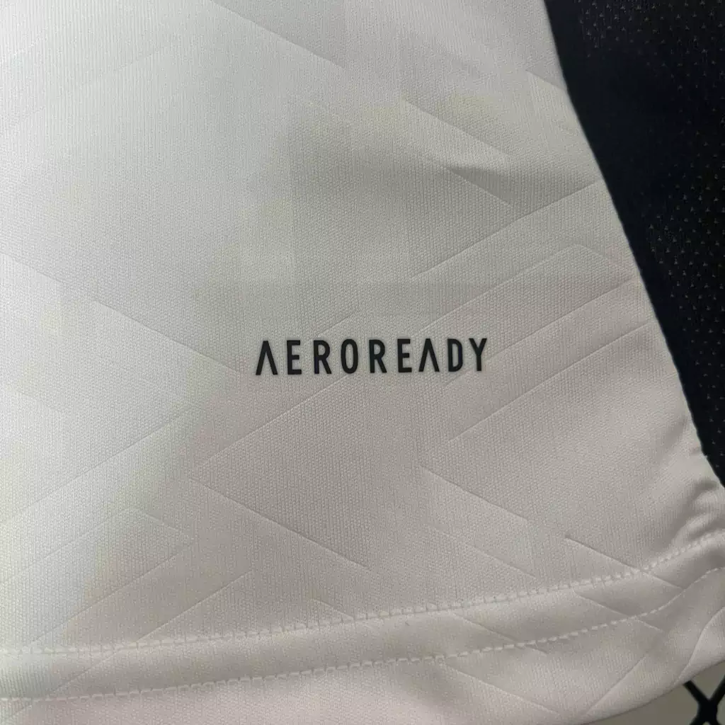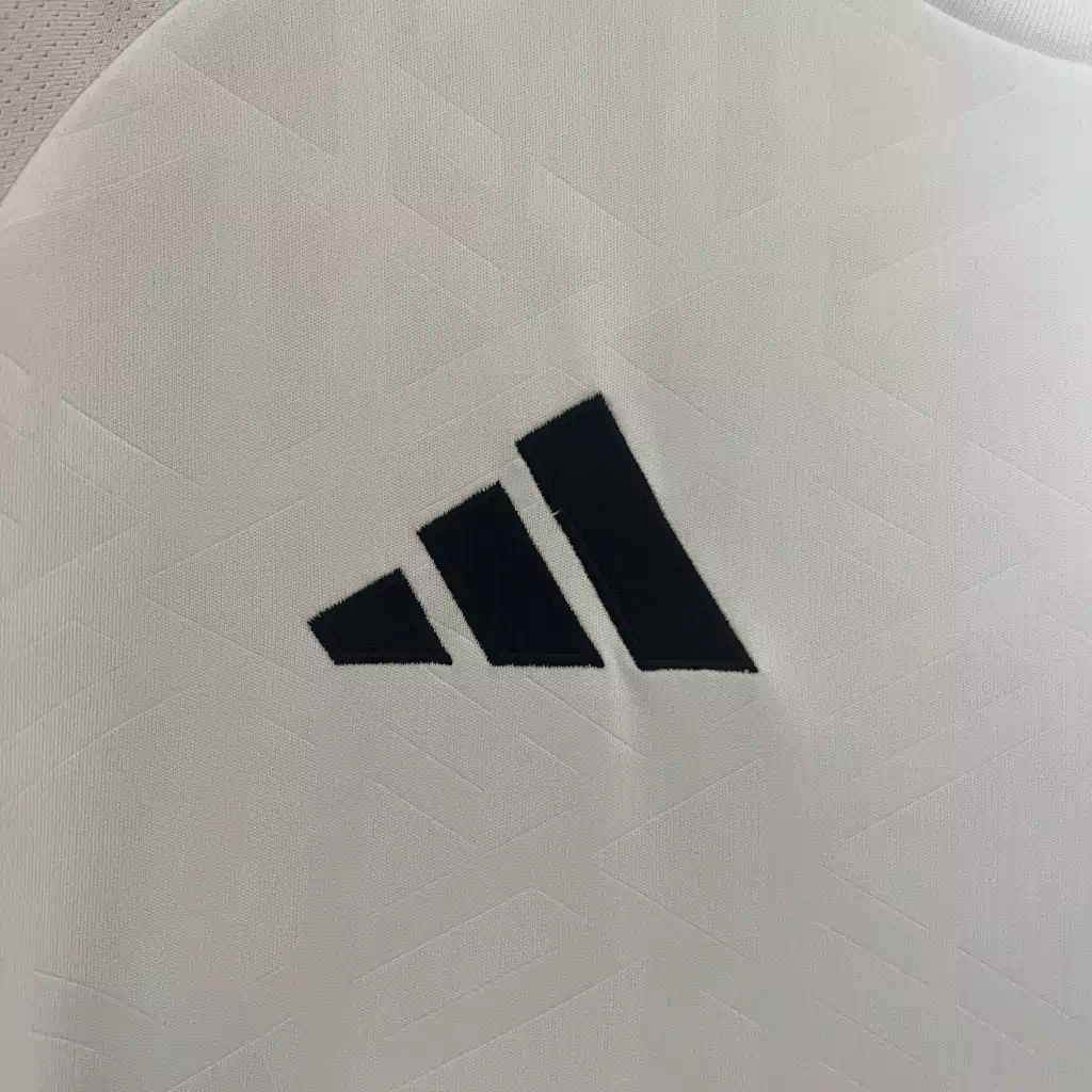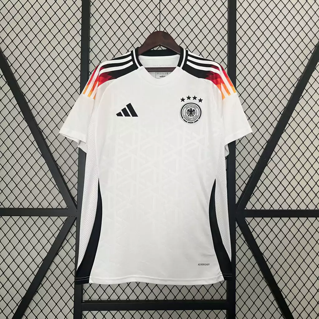 A camisa titular da Alemanha para a Euro é uma representação refinada do estilo contemporâneo, baseada no novo template da marca alemã. Com um design predominantemente branco, ela é adornada com um padrão jacquard que percorre todo o corpo do manto, destacando o icônico logo “DFB” (Federação Alemã de Futebol) em uma sequência elegante.