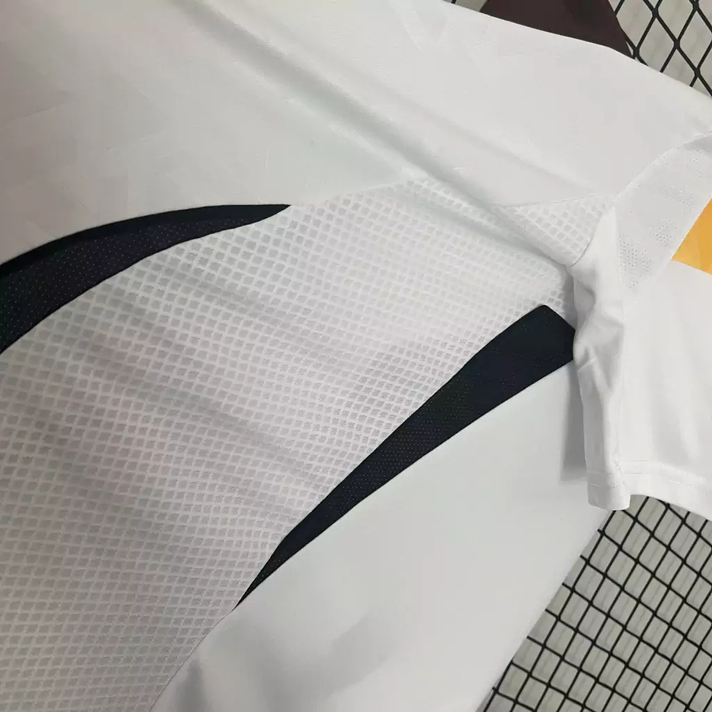 A gola redonda acrescenta um toque de sofisticação, com a parte frontal em branco contrastando com a nuca preta, realçada por um friso central branco. Abaixo da gola, o nome do país é exibido na língua materna, substituindo o tradicional “Die Mannschaft”, agregando um elemento de autenticidade e orgulho nacional.