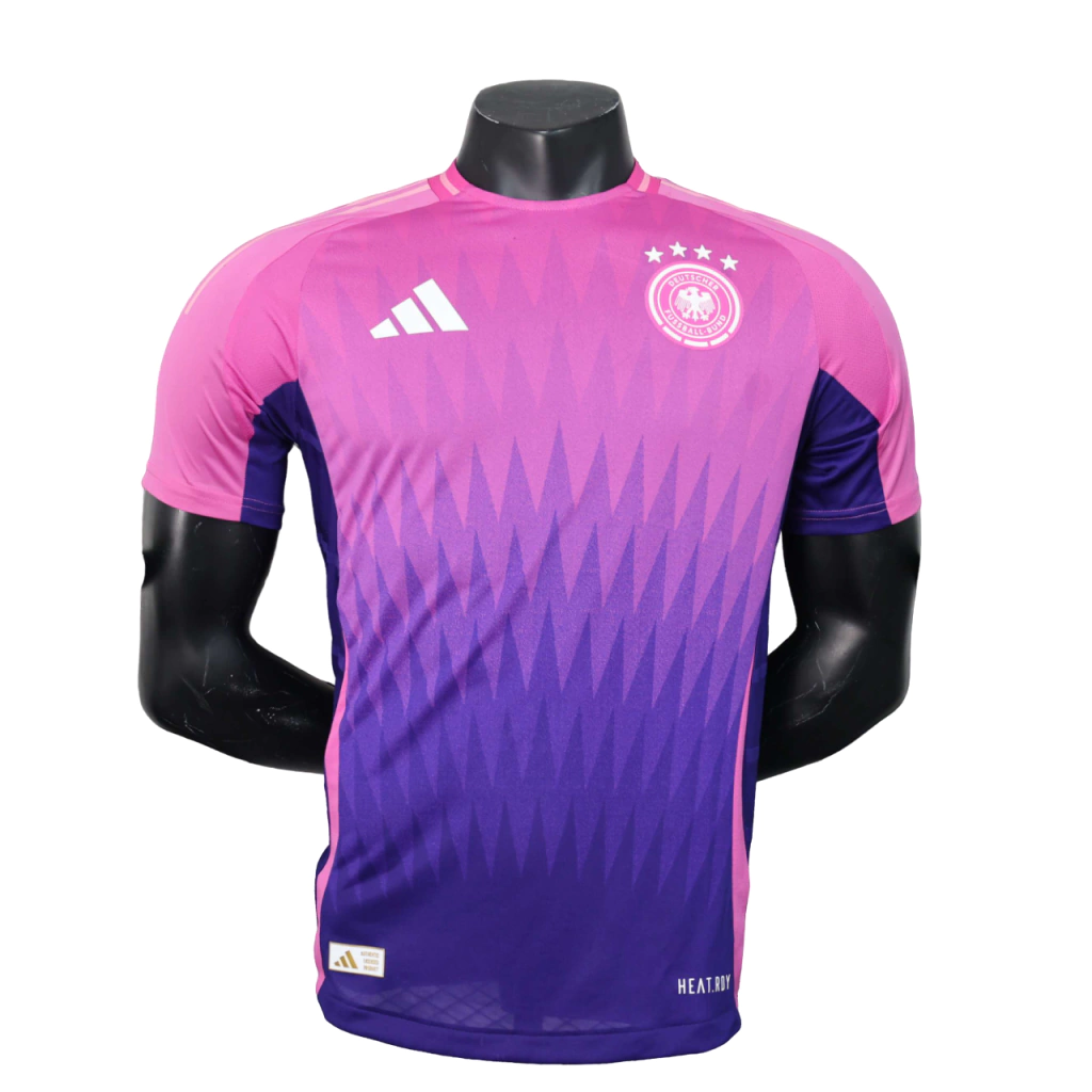 O escudo da DFB é aplicado em magenta com elementos brancos no lado esquerdo do peito, enquanto o logo da Adidas, na mesma cor, está posicionado no lado direito. Esta camisa não apenas reflete a inovação, mas também homenageia a história da seleção alemã de futebol.