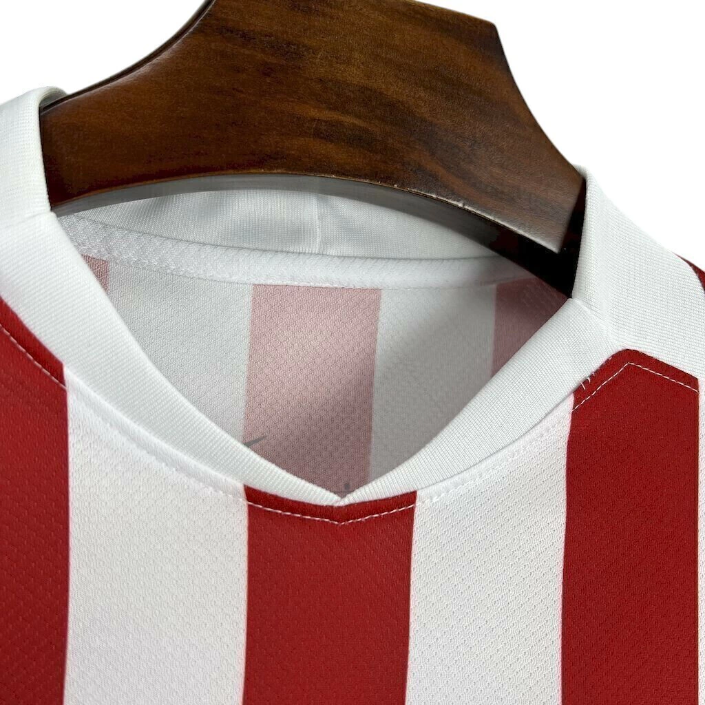 A camisa traz o clássico visual em vermelho e branco, com listras verticais em tom intenso e efeito levemente ondulado.
