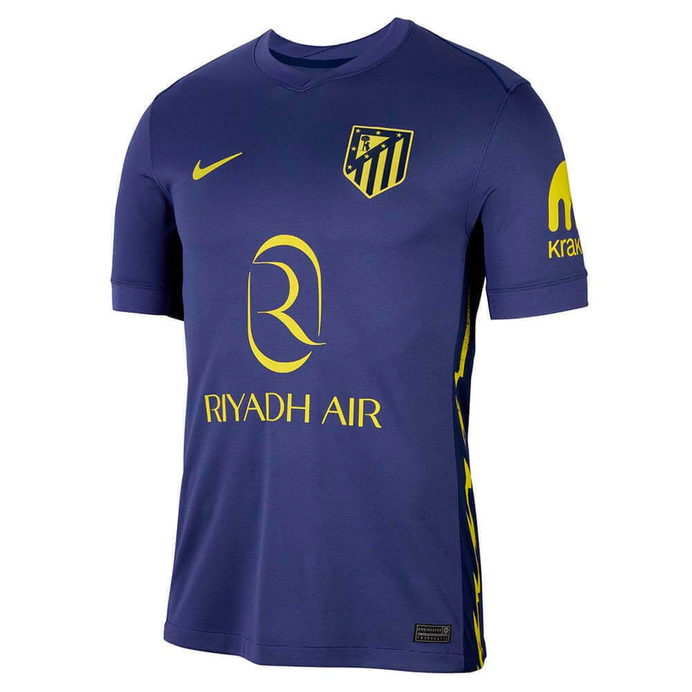 A camisa alternativa do Atlético de Madrid para a temporada 25/26 traz um visual moderno em tom azul arroxeado com detalhes em amarelo vibrante.