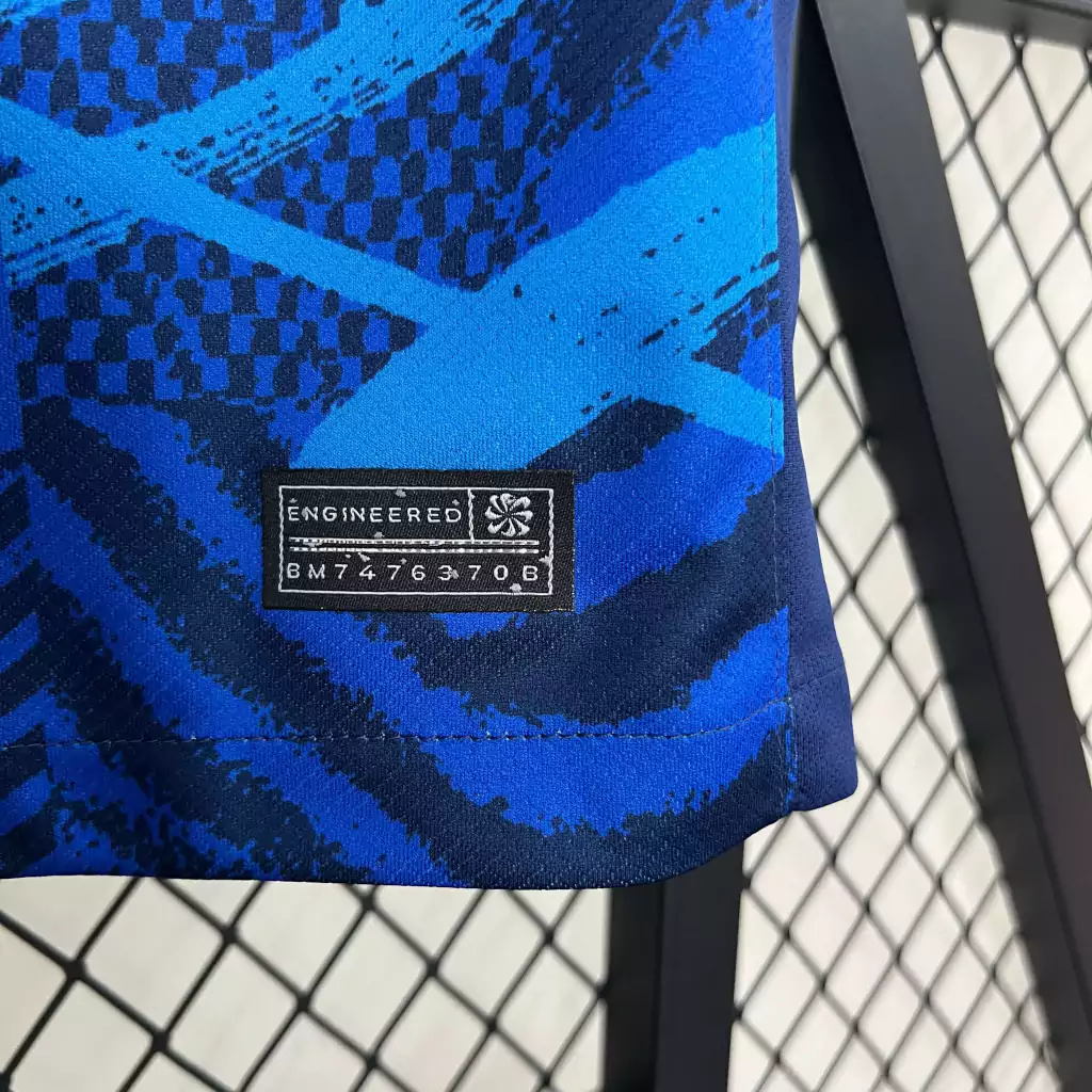 A nova terceira camisa do Atlético de Madrid é predominantemente azul, com gráficos sofisticados em diversos tons da mesma cor. Esses gráficos se mesclam ao longo do corpo do manto, criando um efeito visual dinâmico e moderno que destaca a identidade criativa e inovadora da equipe.
