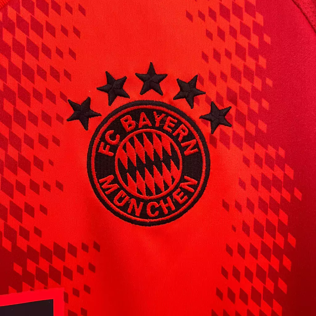 O nome do kit é “Treble Red”, que não só representa os três tons de vermelho, mas também faz referência ao fato de o clube ser o único time alemão da história a conquistar a tríplice coroa – vencendo a Bundesliga, a Copa da Alemanha e a Champions League na mesma temporada. Com um tom de vermelho enérgico como base, o manto apresenta as tradicionais faixas verticais estilizadas em um tom mais escuro de vermelho, formado por retículas de diamantes, um símbolo presente no escudo e na bandeira da Baviera.