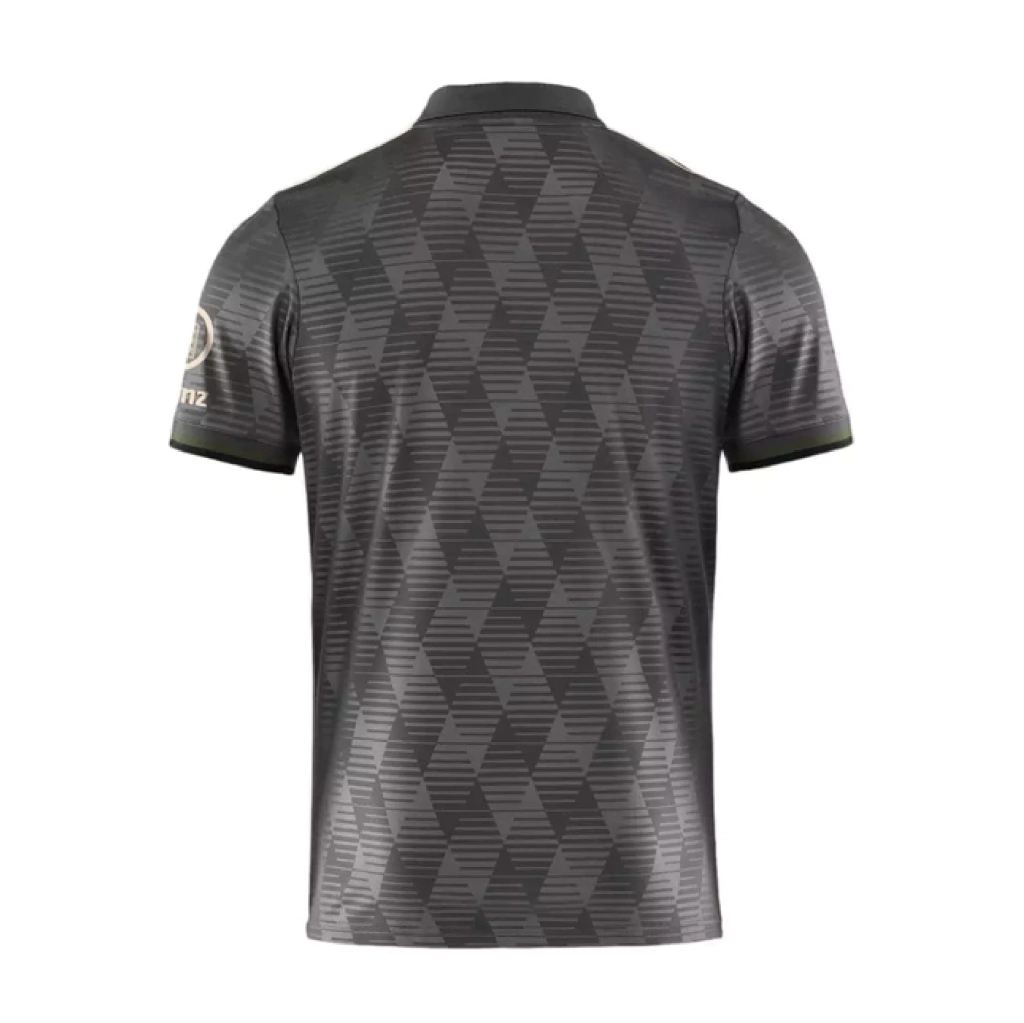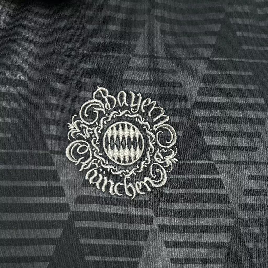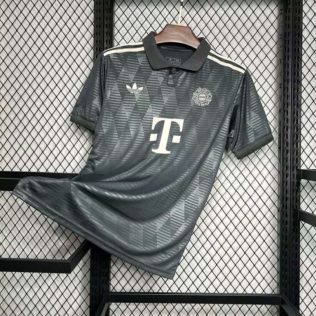 A nova camisa especial do Bayern de Munique para a Oktoberfest 2024 homenageia o “Trachten,” traje tradicional alemão usado durante a festa, com uma base cinza e um padrão gráfico de diamantes em tom sobre tom.