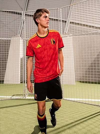 A camisa titular da Seleção da Bélgica traz o vermelho como base e combina tradição e inovação com uma estampa gráfica sutil de tridentes e chamas, referência aos “Diabos Vermelhos” e às “Chamas Vermelhas”.