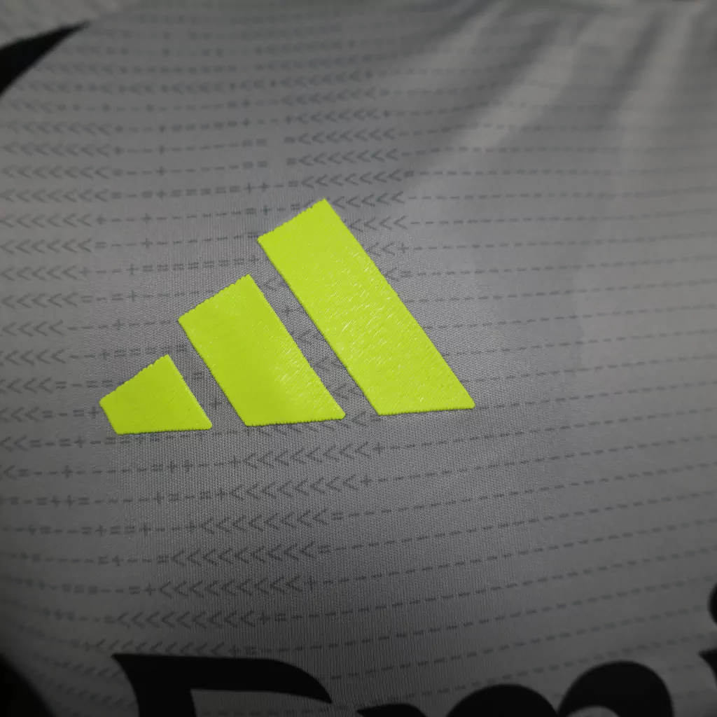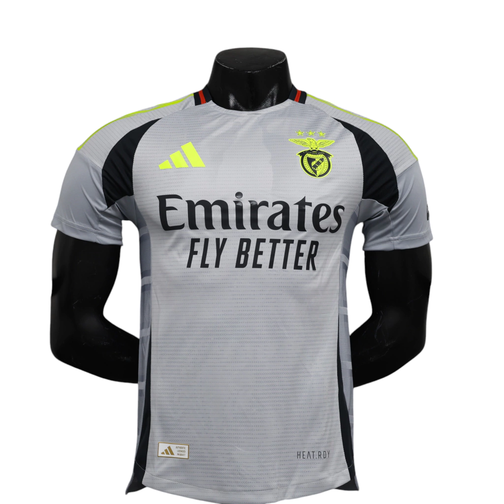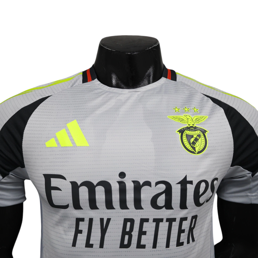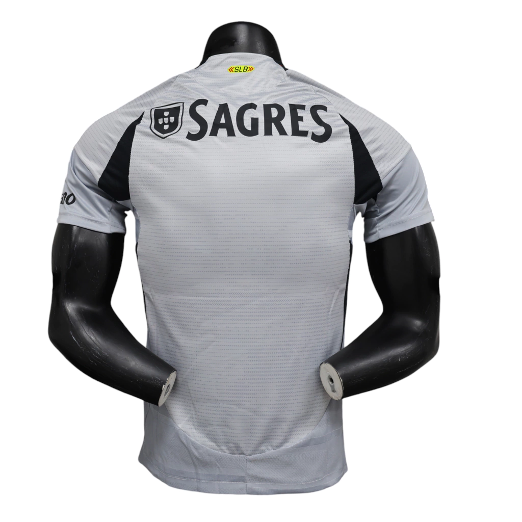 Nas costas, o uniforme é totalmente cinza, com a sigla "SLB" em preto sobre um fundo amarelo na nuca.