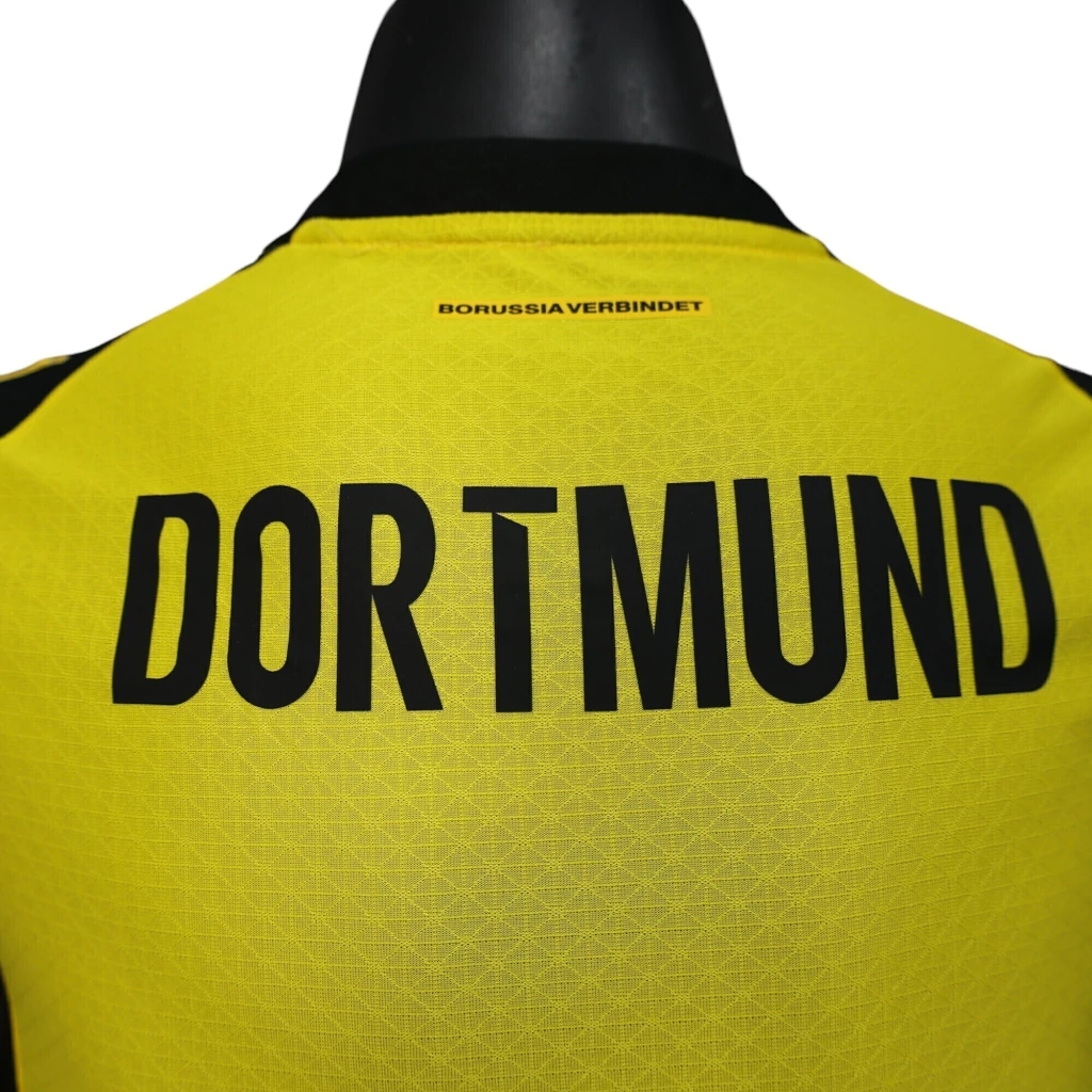 Nas costas, o lema “Borussia verbindet” (“O Borussia conecta”) reforça os laços entre clube, torcida e cidade.
