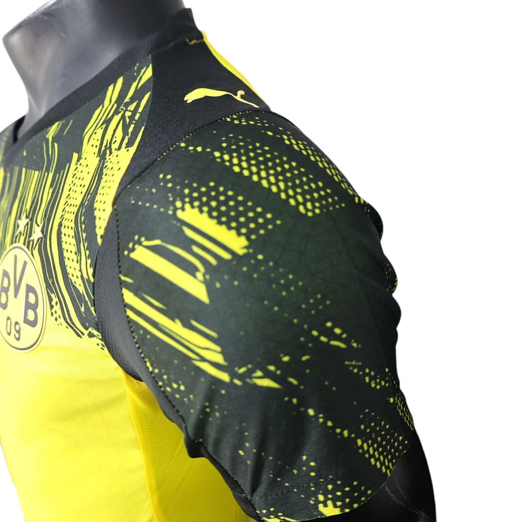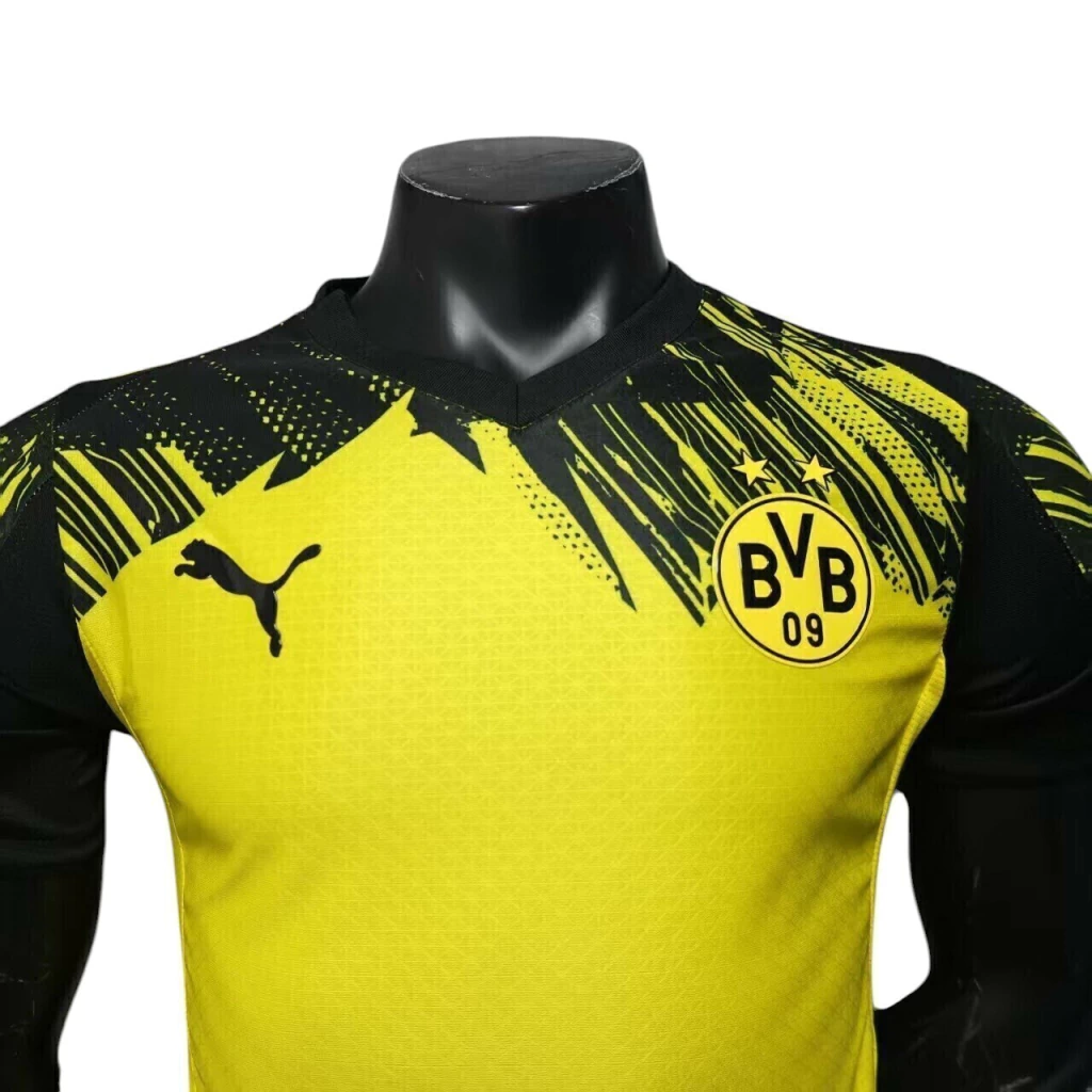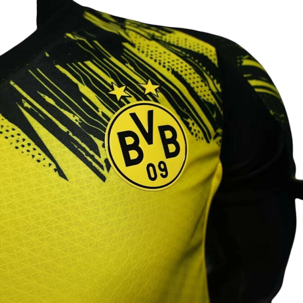 A gola em “V” preta se conecta aos ombros também em preto, trazendo equilíbrio ao design. O escudo do Dortmund aparece no lado esquerdo e o logo da fornecedora em preto e amarelo nos ombros.