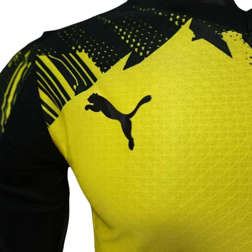 A nova camisa HOME do Borussia Dortmund para 2025/26 mantém o tradicional amarelo vibrante, agora com gráficos pretos distorcidos no peito e mangas, simbolizando a energia das arquibancadas do Signal Iduna Park.