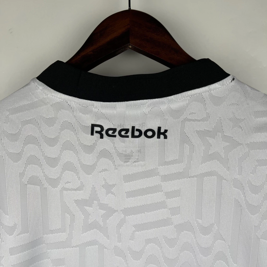 Na região das costas, o preto domina a maior parte, com as listras aparecendo somente na metade inferior. O emblemático escudo com a estrela solitária é posicionado no lado esquerdo do peito, enquanto o logotipo da Reebok, apresentado em branco com bordas pretas, graciosamente se encontra no lado direito.