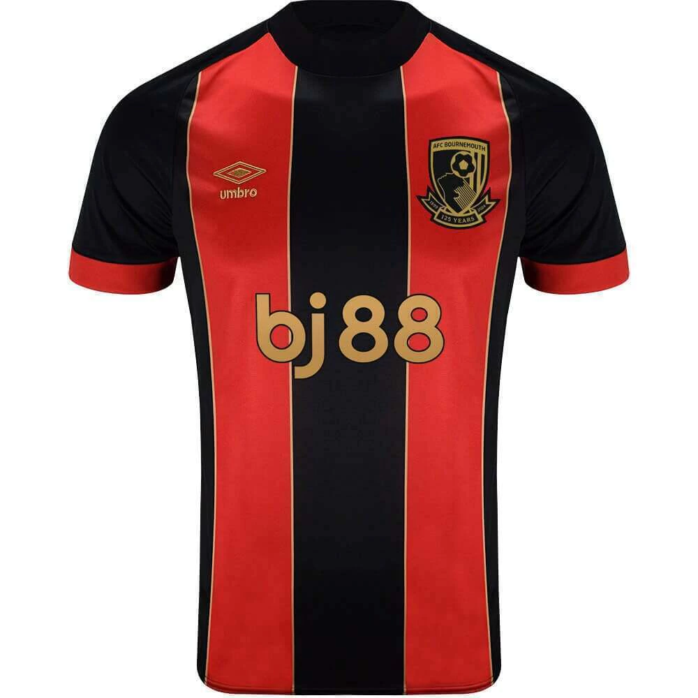 A gola é circular em preto, assim como as mangas, que possuem punhos vermelhos. No lado esquerdo do peito, está o emblema do Bournemouth em sua versão oficial, enquanto o logotipo da Umbro, em uma edição especial de centenário, aparece em dourado no lado direito.
