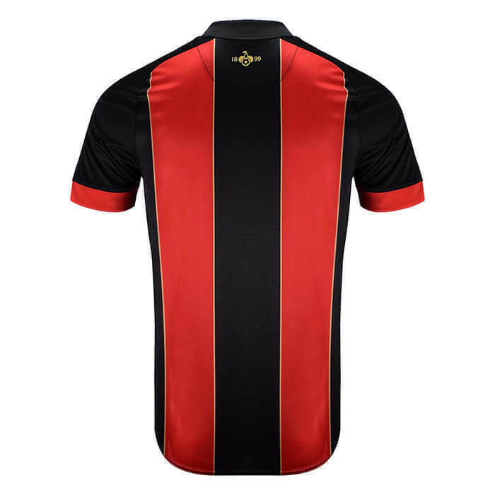 A nova camiseta principal do Bournemouth apresenta largas faixas verticais em preto e vermelho, intercaladas por finas linhas douradas.