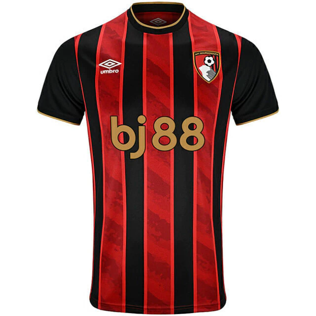 A gola redonda preta recebe contorno dourado, mesma cor dos punhos. O escudo do Bournemouth aparece do lado esquerdo do peito, enquanto o logo da Umbro em branco completa o lado direito.