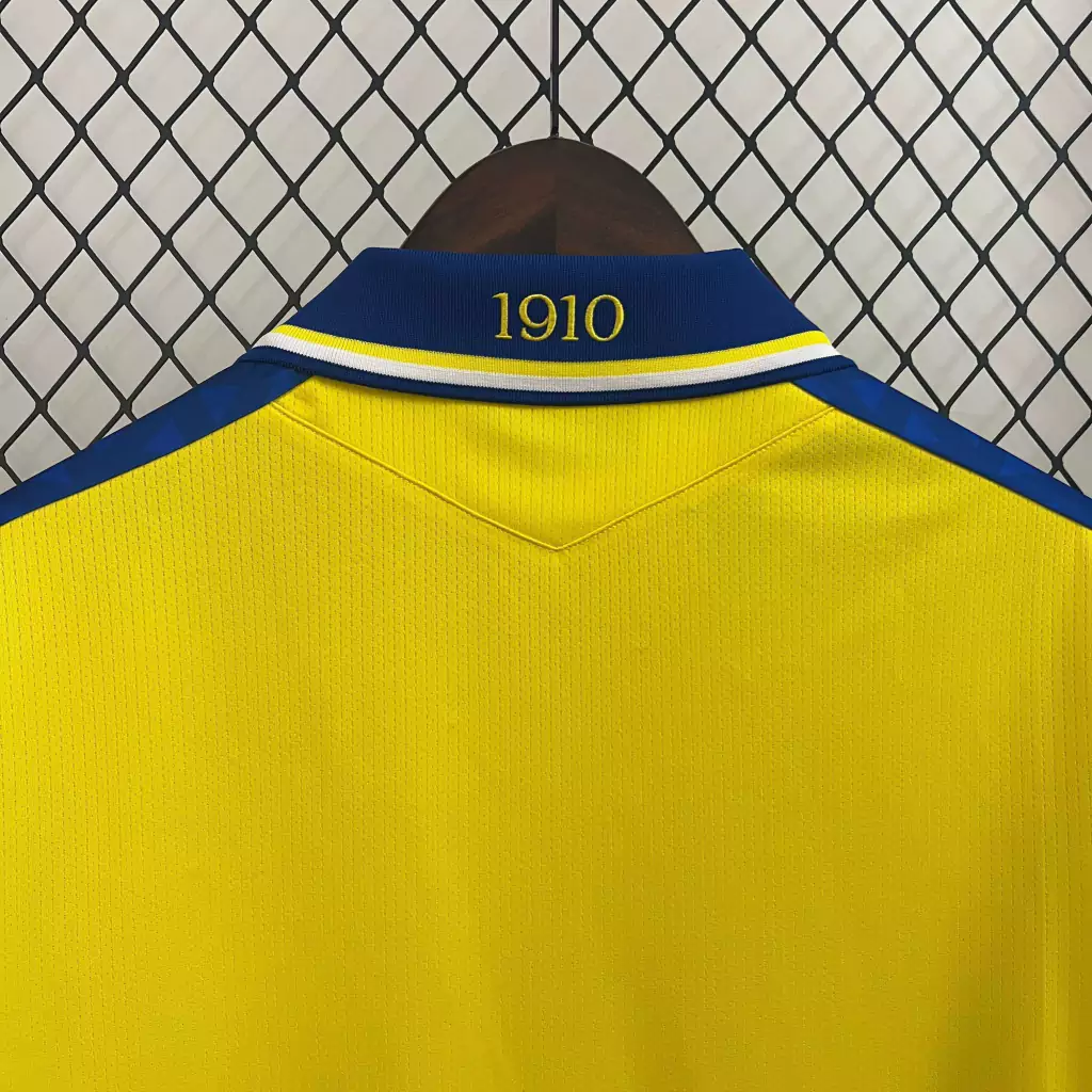 O azul royal é a cor secundária, presente em faixas nas mangas e na gola pólo, que possui faixas em amarelo e branco. A gola em V é branca, com faixas em azul e amarelo, um padrão que também se repete nos punhos.