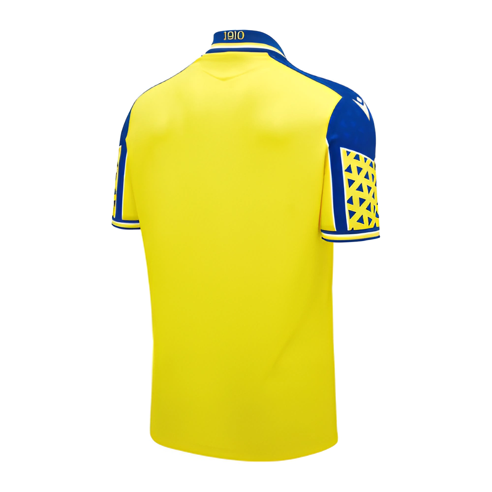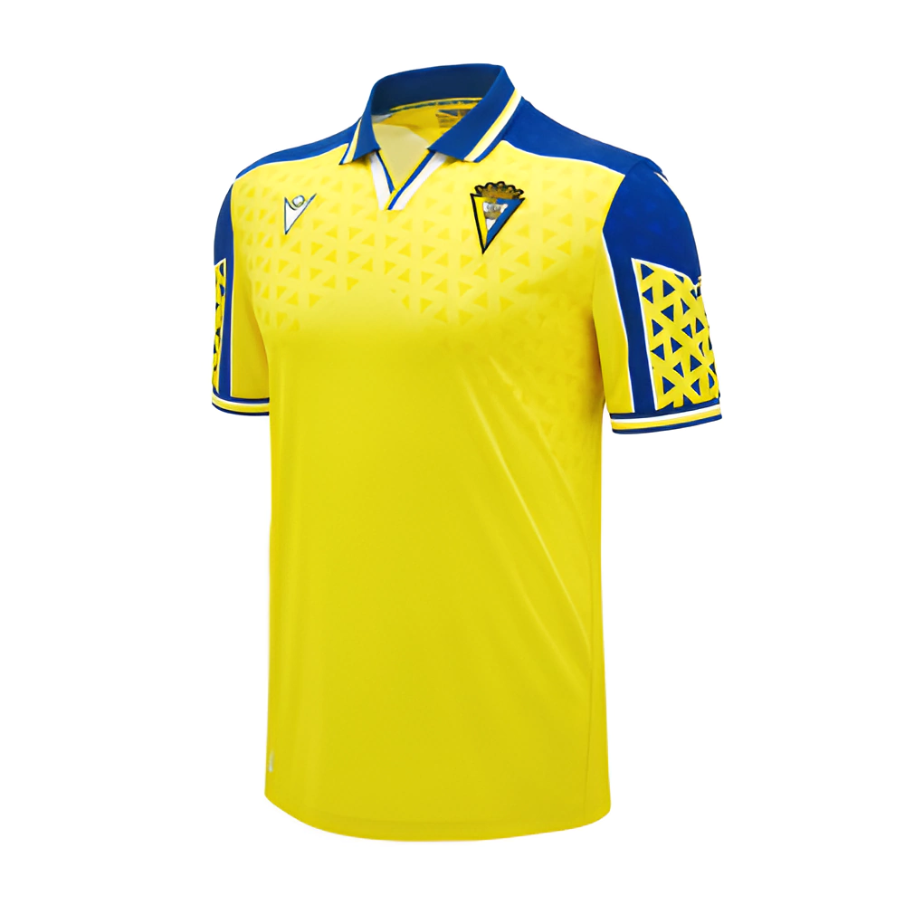 Na nuca, está estampado o ano de fundação do clube, destacando a tradição do Cádiz. As mangas apresentam um grande desenho geométrico amarelo, com contorno branco e triângulos azuis no interior. Triângulos também aparecem na área azul da camisa, reforçando a temática geométrica do design.