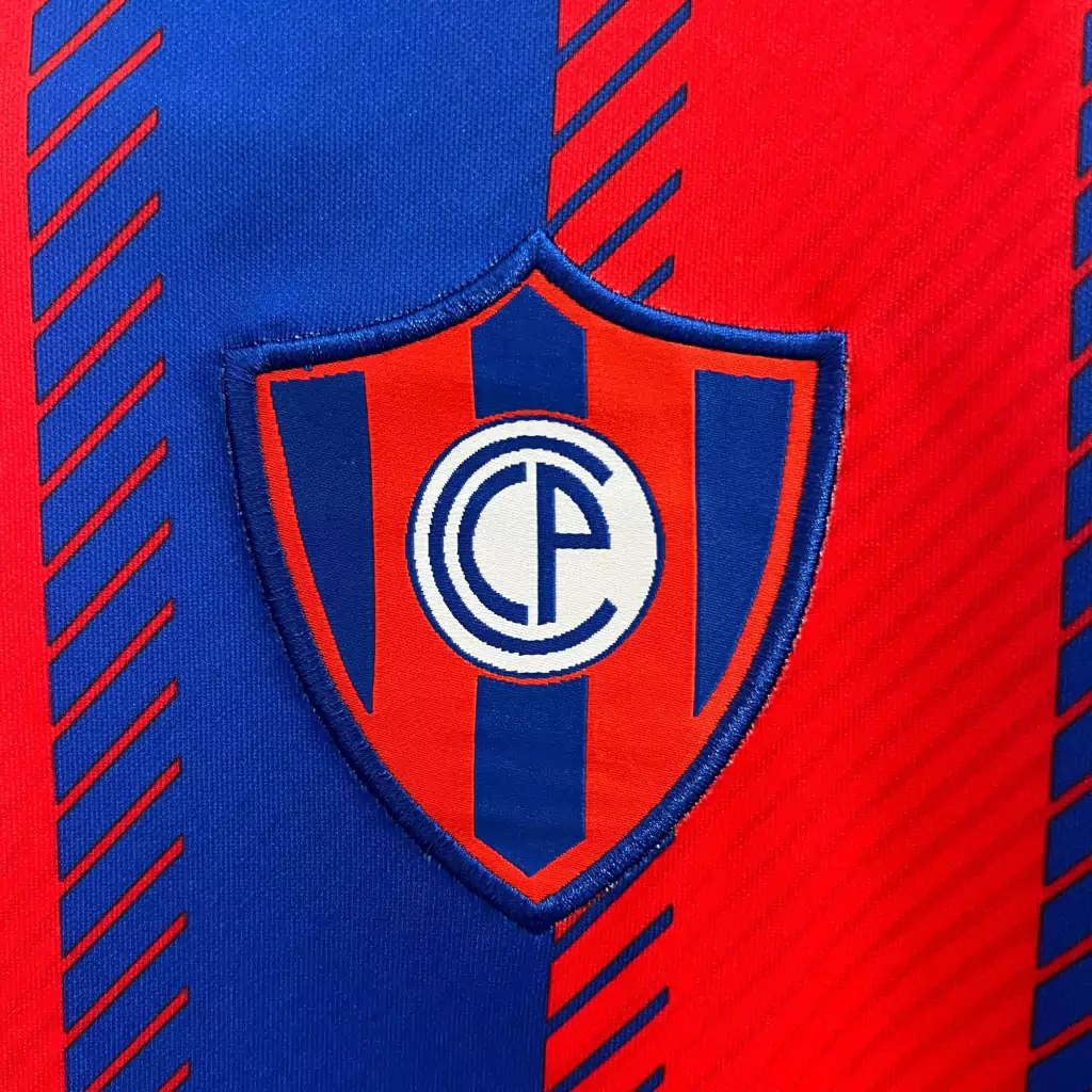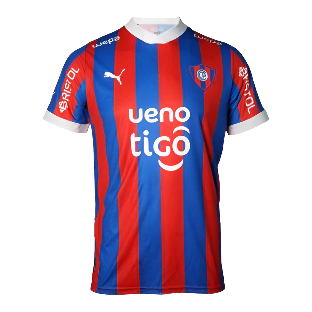 O escudo do Cerro Porteño está posicionado no lado esquerdo, em sua versão atual padrão. O logo da PUMA, junto com os patrocinadores, é estampado em branco, complementando a paleta de cores da camisa.