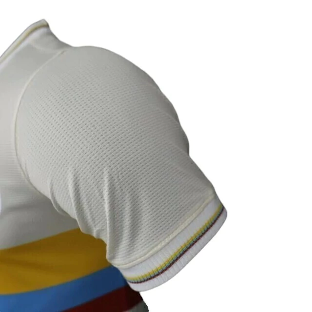 A gola redonda e os punhos também são brancos, com uma fina faixa centralizada que exibe a bandeira do país.