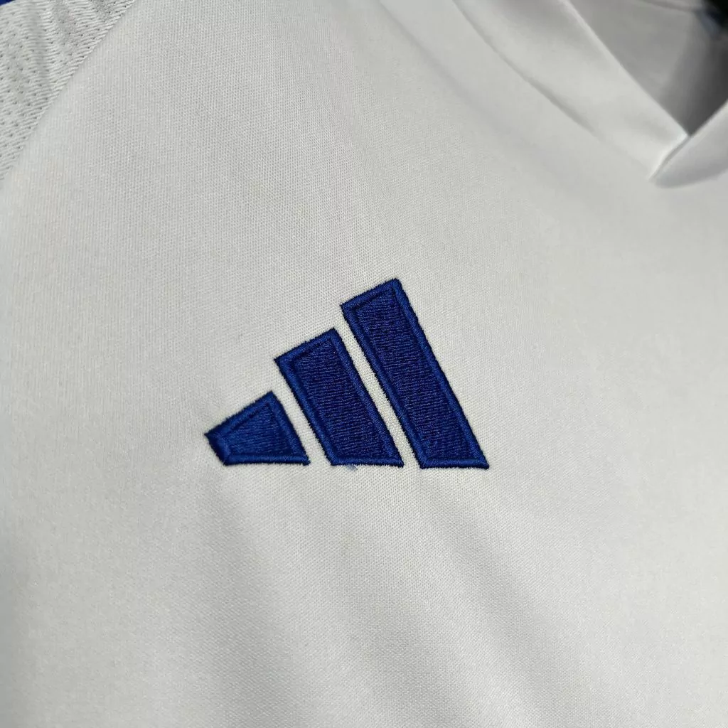 O escudo do clube está posicionado no lado esquerdo do peito, enquanto o logo da Adidas, em azul, aparece no lado direito.