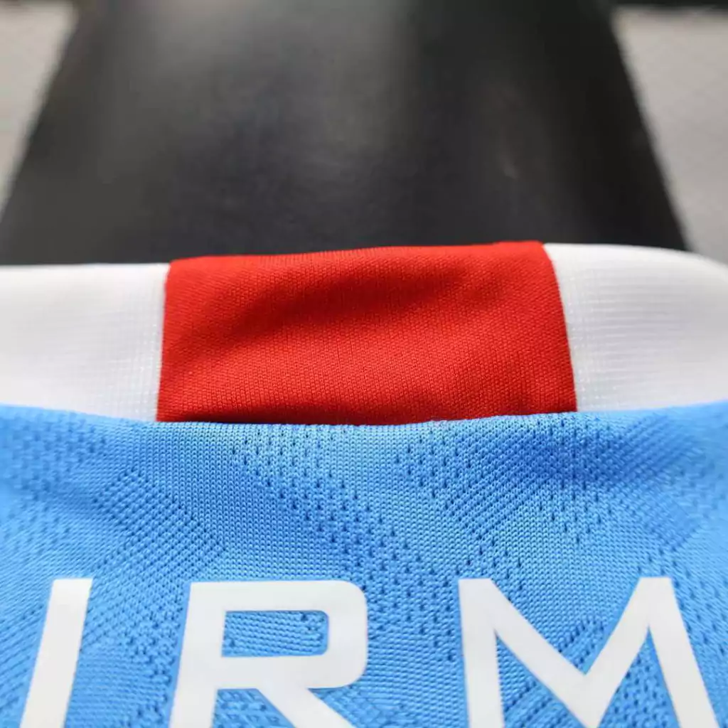Ela possui gola redonda branca com um toque de vermelho na parte da nuca, enquanto os punhos brancos são adornados por três linhas finas em azul celeste.