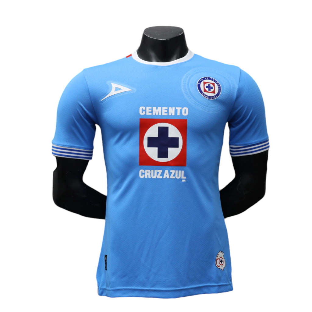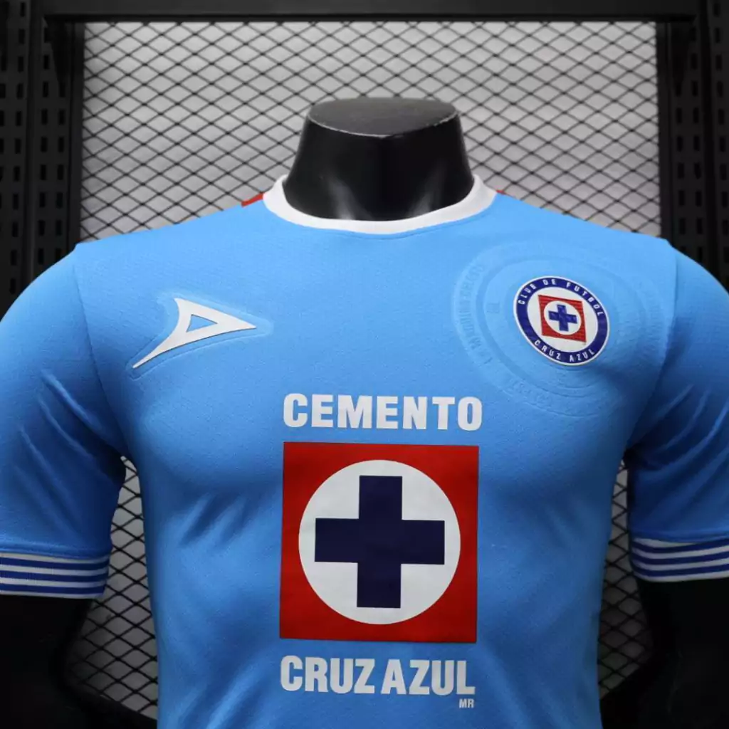 O logo da Pirma aparece em branco, assim como o patrocínio master da Cemento Cruz Azul, empresa proprietária do clube.