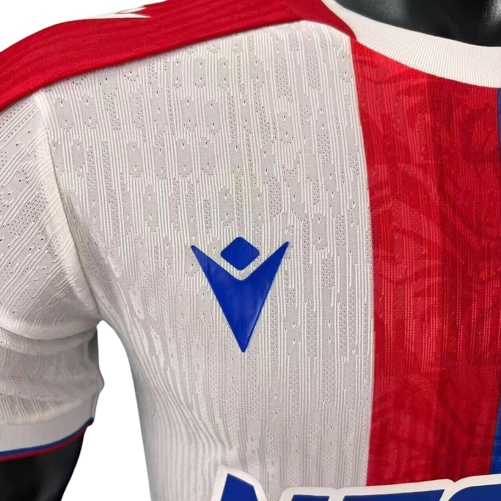 A nova camisa AWAY do Crystal Palace para 2025 tem o branco predominante e destaca uma faixa vertical central dividida em tons de vermelho e azul, com ilustrações da águia no interior.