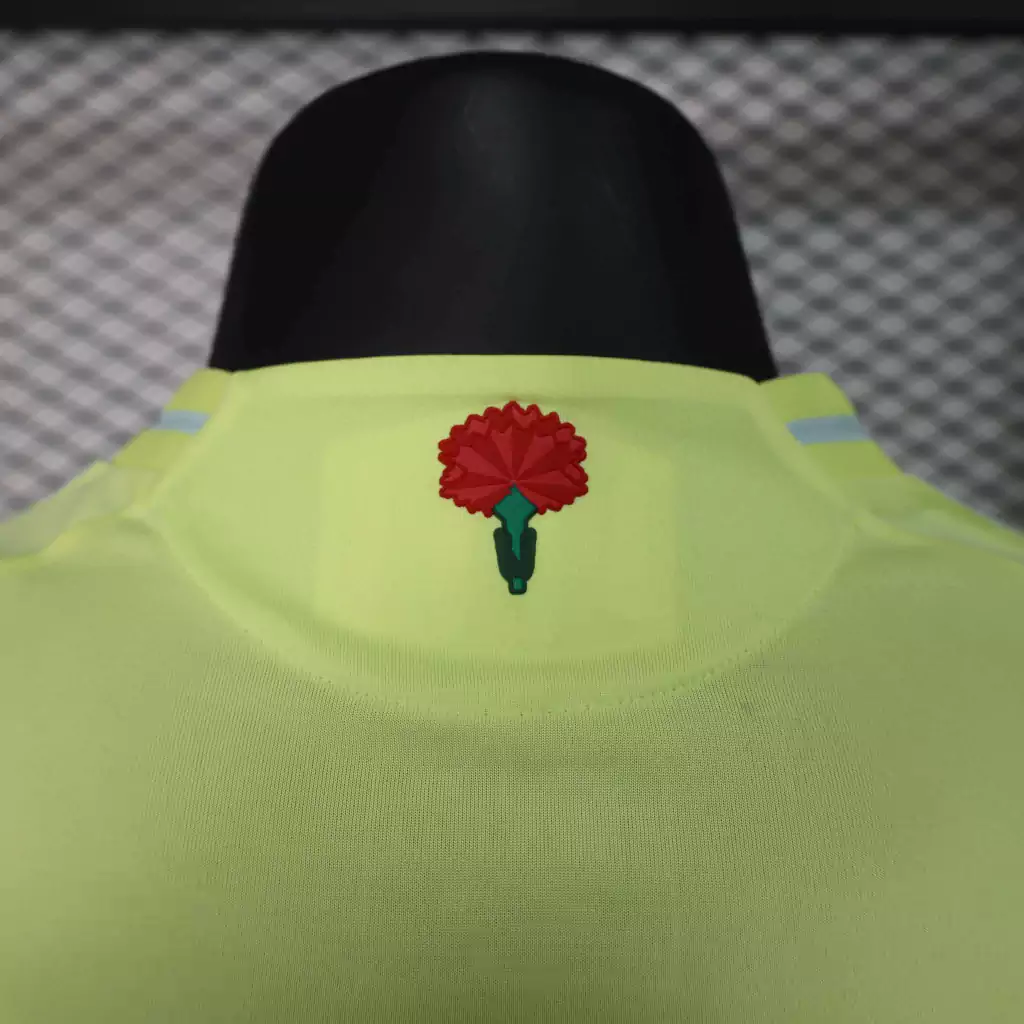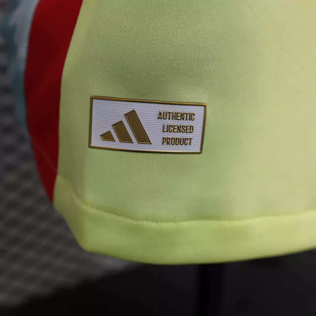 A nova camisa reserva da seleção espanhola surpreende ao adotar o amarelo como cor predominante, em contraste com os tradicionais branco ou azul marinho. A tonalidade neon é uma homenagem ao sol radiante e ao verão espanhol.