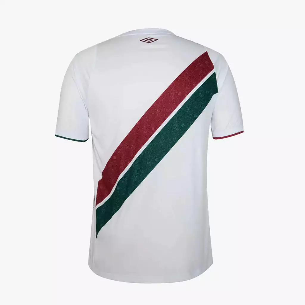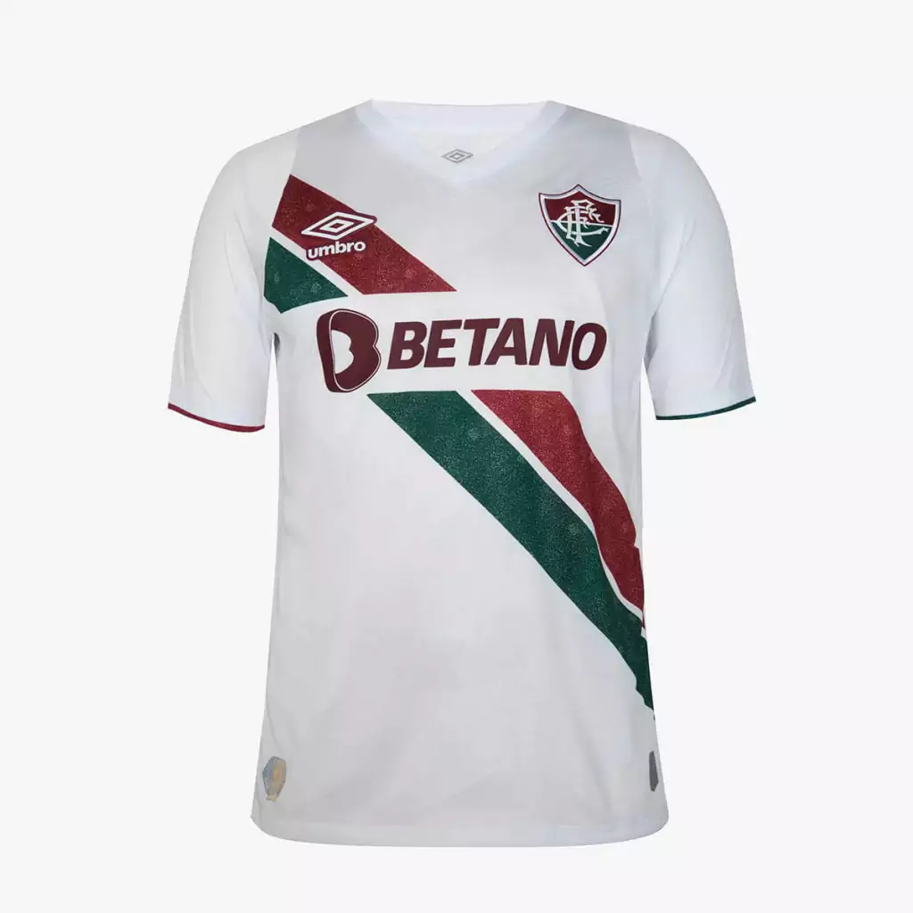 O escudo do Tricolor das Laranjeiras é posicionado no lado esquerdo do peito, enquanto o logo da Umbro é colocado no lado direito sobre a faixa grená, também em branco, com bordas grená. Na versão masculina, as faixas são interrompidas por um bloco branco, onde o patrocínio da Betano é apresentado em verde.