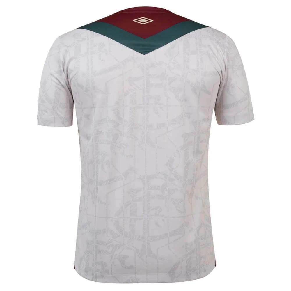 O emblema do Fluminense é apresentado em sua versão oficial na parte esquerda, enquanto o logo da Umbro, em sua edição centenária, que exibe as cores grená e verde, é também utilizado nos espaços de patrocínio.