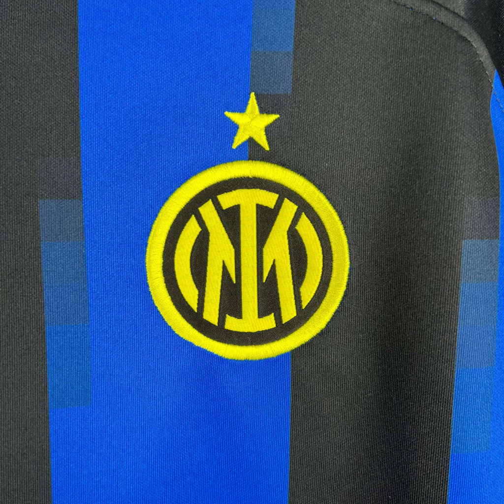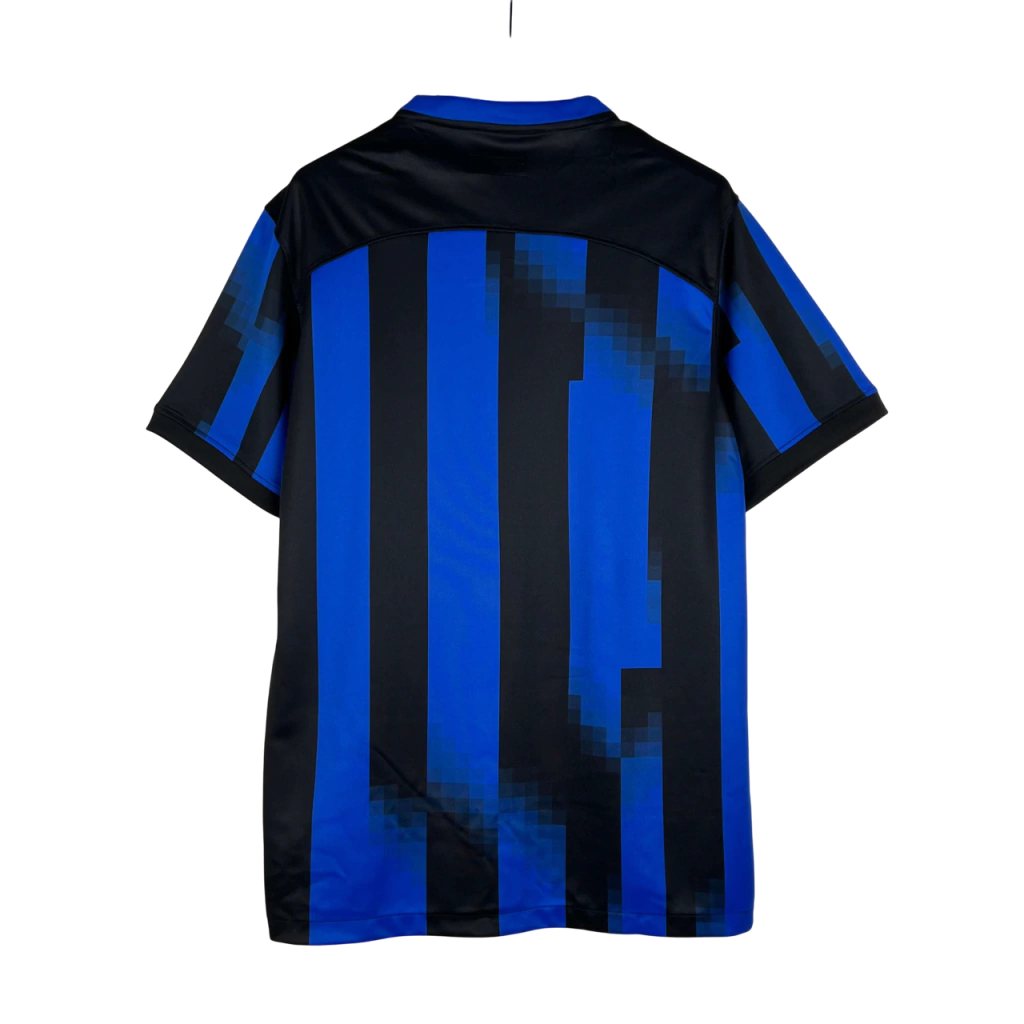 A camiseta principal da Inter de Milão para a temporada 2023-2024 é desenvolvida a partir do modelo da Nike para este período, apresentando um fundo azul e três faixas verticais pretas estilizadas, em um efeito de “glitch”, que também se estende para as laterais e as mangas.
