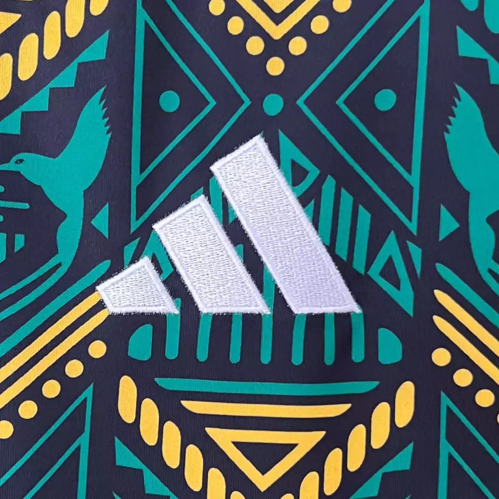 O manto reserva da seleção apresenta um design personalizado, com um padrão no corpo em verde, amarelo e preto que remete à cultura do país. Este padrão inclui imagens do pássaro que é símbolo nacional, conferindo um toque autêntico e significativo ao uniforme.