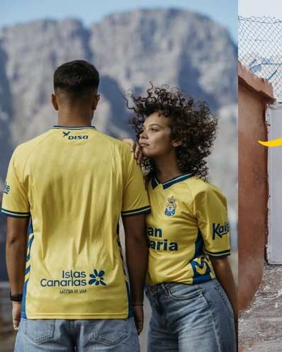 A camisa titular do UD Las Palmas mantém o amarelo tradicional como base e traz o azul em faixas laterais, além de aparecer na gola e nos punhos, sempre com faixas amarelas centralizadas.