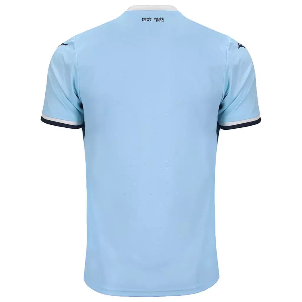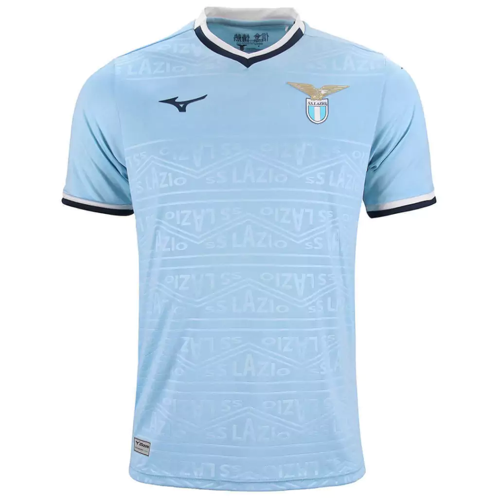 O escudo da Lazio é aplicado no lado esquerdo, enquanto o logo da Mizuno aparece no lado direito, ambos em azul escuro.