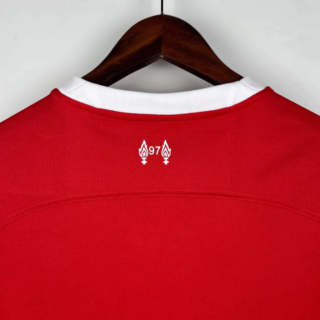 Na nuca, o número 97 ao lado de tochas recorda as almas perdidas na tragédia de Hillsborough, um lembrete do apoio eterno da torcida e do respeito aos que se foram. O Liver Bird, em branco, repousa com graciosidade no lado esquerdo do peito, enquanto o Swoosh da Nike, também em branco, destaca a qualidade inegável deste kit.