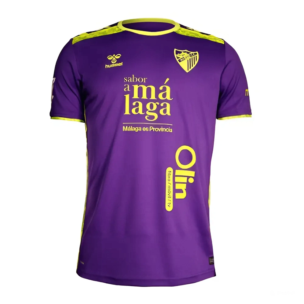 O logo da Hummel, em forma de abelhinha, é estampado em verde-limão no lado direito do peito, enquanto o escudo do Málaga aparece no lado esquerdo em uma versão vazada na mesma tonalidade.