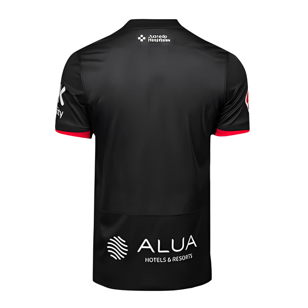A nova camisa THIRD do Mallorca para 2025 tem o preto predominante e se destaca pelo grande chevron vermelho no peito, inspirado em modelos clássicos da fornecedora.