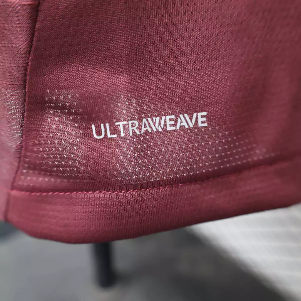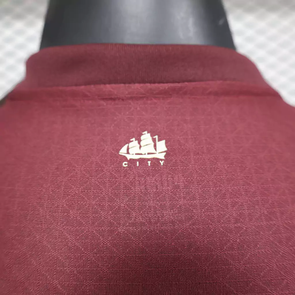 A nova terceira camisa do Manchester City para a temporada é bordô, com destaque para o navio, visto no escudo do clube, que é aplicado de forma tonal na parte frontal do kit.