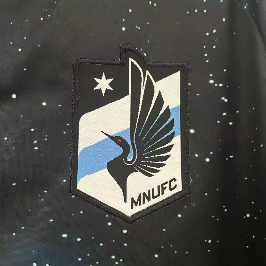 A nova camisa titular do Minnesota United tem a base preta e apresenta estrelas de diferentes tamanhos e intensidades de cores, formando uma interessante textura com degradê para branco e azul celeste.
