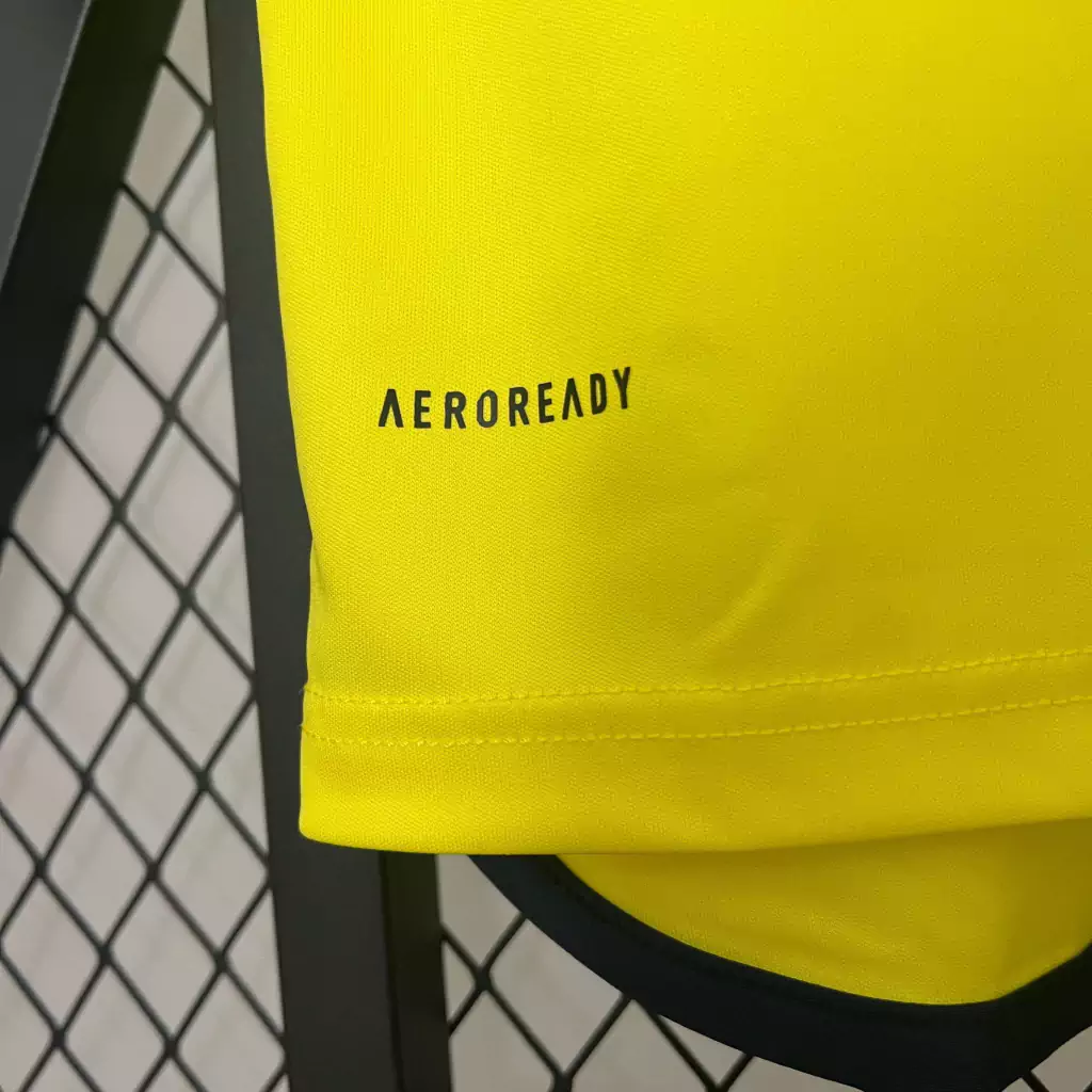 O manto segue o template padrão da marca alemã e é predominantemente amarelo, com uma larga faixa horizontal azul marinho no peito, mesma cor das faixas laterais que se encontram na barra traseira, das três listras nas mangas, e dos detalhes na gola e nos punhos.