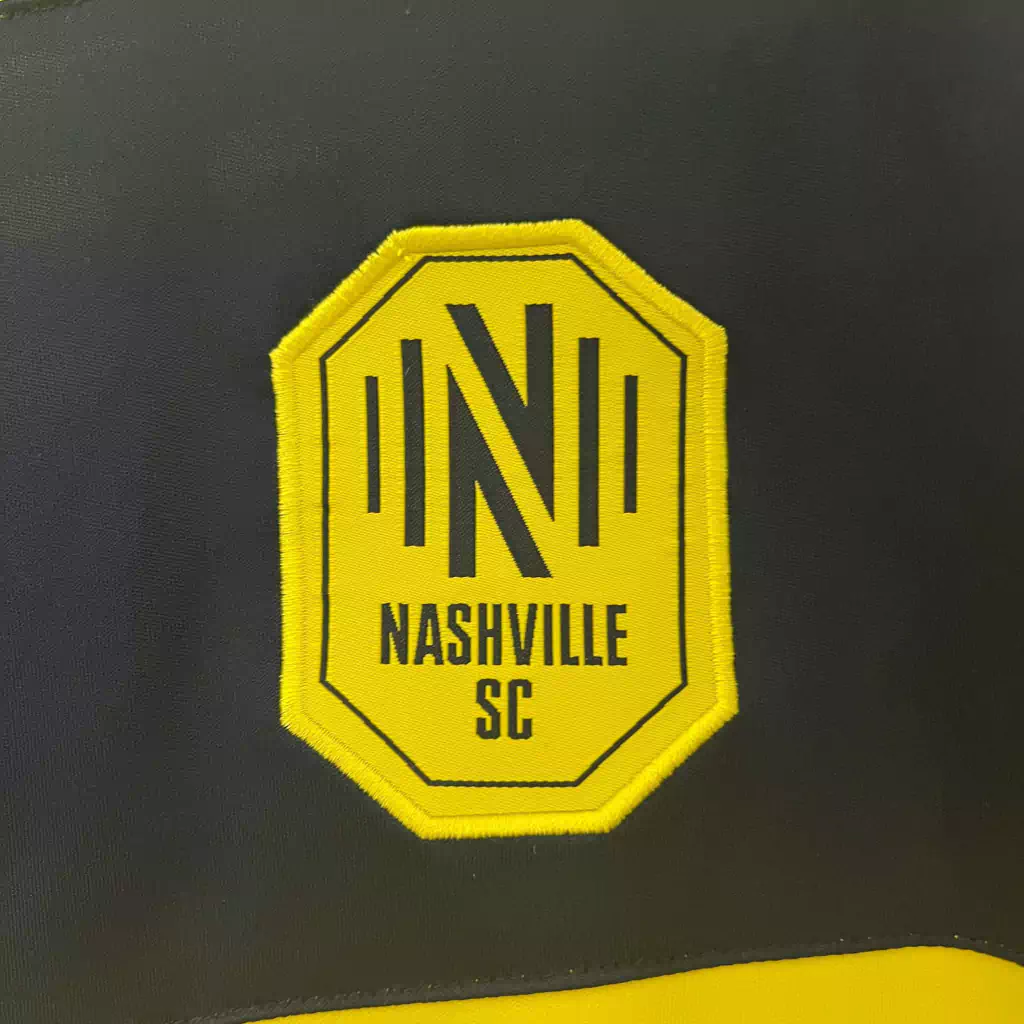 A Adidas estampa seu logo em amarelo no lado direito do peito, enquanto o escudo do Nashville está no lado esquerdo, em sua versão atual padrão.