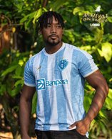 A camisa HOME do Paysandu mantém as tradicionais listras verticais em azul celeste e branco, aplicadas sobre um tecido com grafismos sutis inspirados nas curvas dos rios da Amazônia.