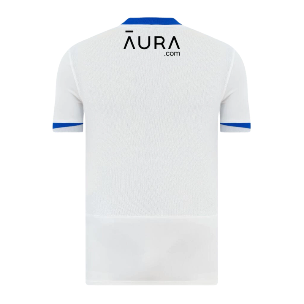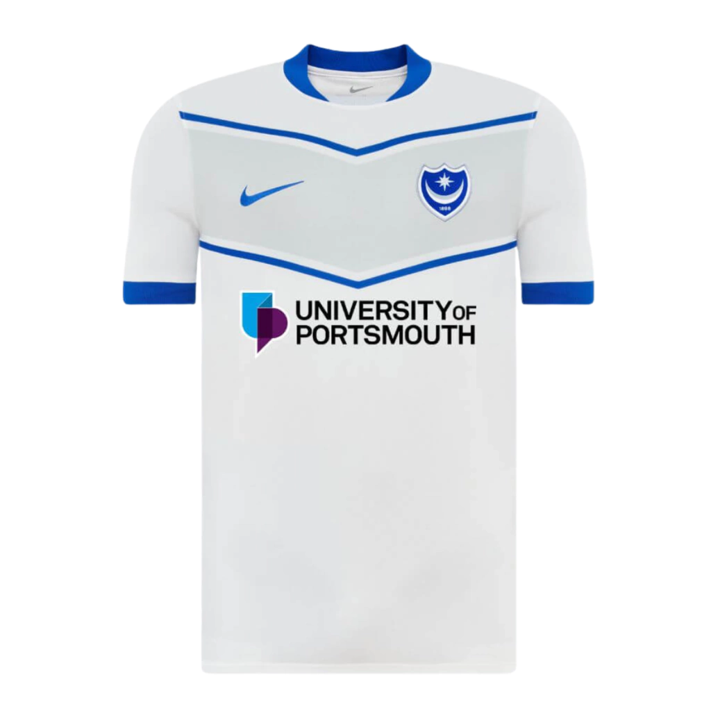 A nova camisa Away do Portsmouth é branca e utiliza um template da Nike. No peito, destaca-se um chevron largo em cinza, contornado por faixas brancas e azul royal, mesma cor usada na gola.
