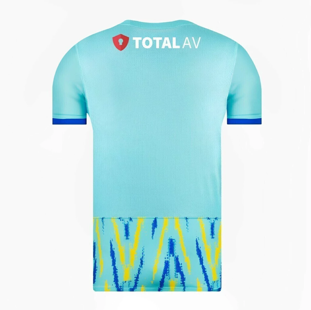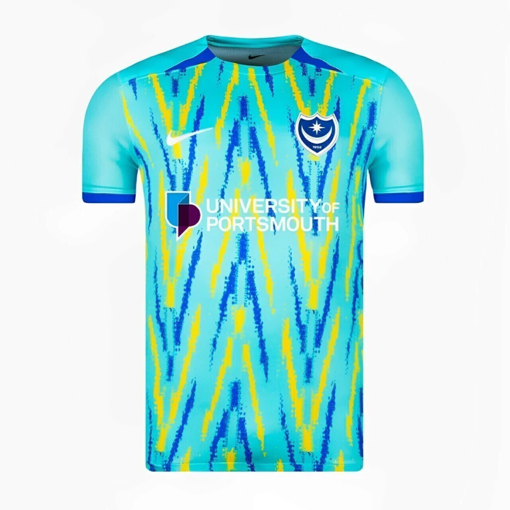 O Portsmouth revela seu novo manto alternativo em turquesa, com um design marcante de chevrons amarelos e azul royal dispostos para cima e para baixo, dando a impressão de terem sido pintados diretamente no tecido.