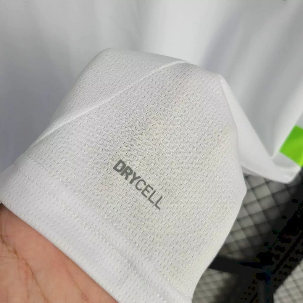 Esse mesmo padrão da gola se repete nos punhos, que harmonizam com as mangas brancas. Recortes laterais em verde completam o visual.