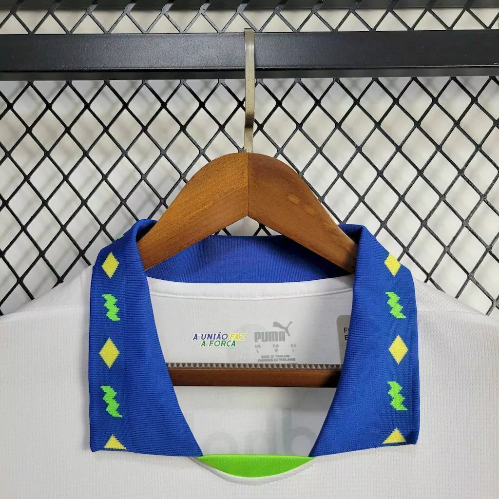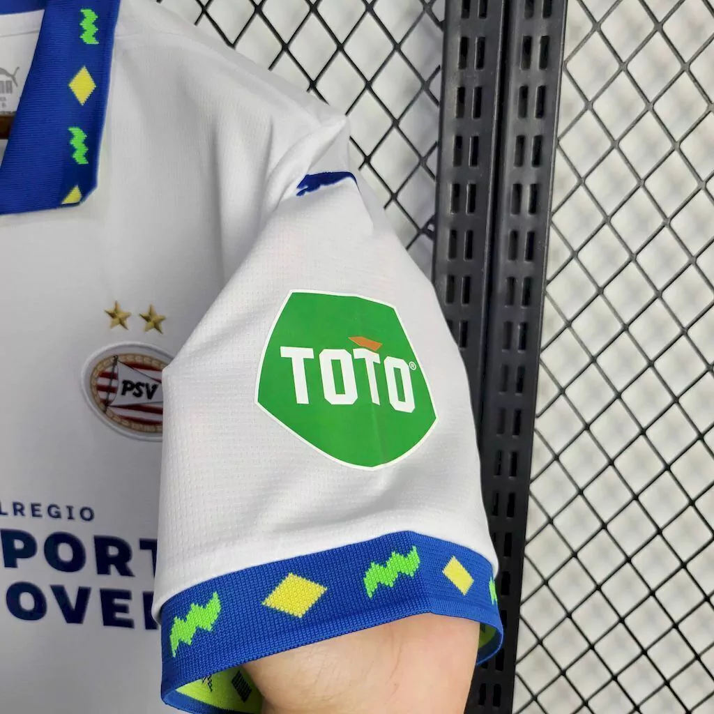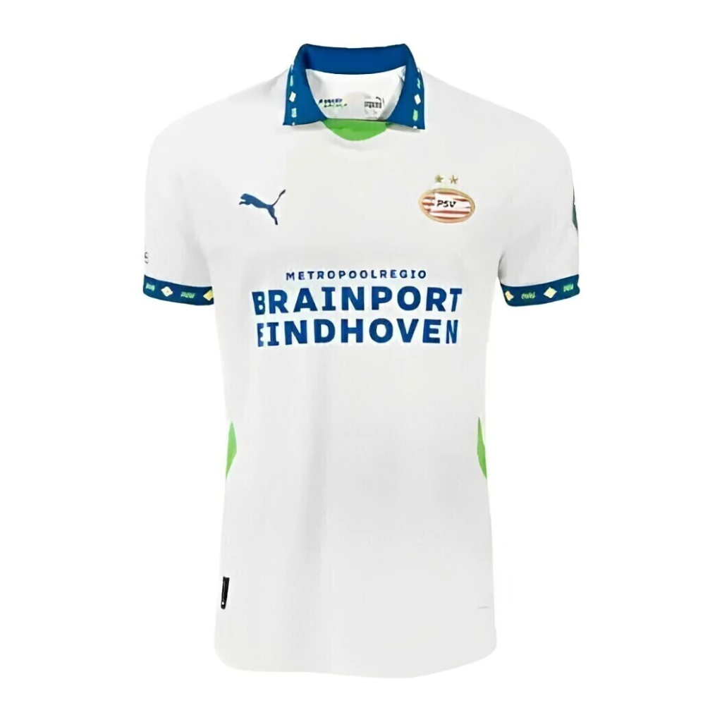 A nova terceira camisa do PSV é predominantemente branca, com detalhes em azul, amarelo e verde em homenagem à bandeira brasileira.